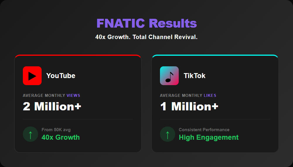 Scaled FNATIC’s YouTube & TikTok into top-performing channels using viral ideation+retention, and revenue-driving content systems.